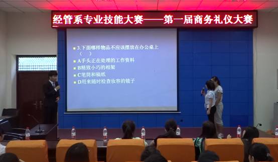 为了让员工更好的掌握商务礼仪知识,使员工在今后的商务工作中形成良好的礼仪习惯,遵守礼仪规范,按照礼仪规范约束自己的行为,经管系陈宁老师于2015年6月25日下午以所授《商务礼仪》课程结课考试为契机,举办了经管系第一届商务礼仪大赛。大赛分为三个环节:商务礼仪仪态展示、商务礼仪知识竞答、商务礼仪才艺比拼。商务礼仪仪态展示选取了优秀的员工为广大师生展示了标准的坐姿、站姿、蹲姿、走姿等动作;商务礼仪知识竞答由参赛员工随机抽出竞答题目现场回答;商务礼仪才艺比拼则由员工根据自己策划演绎的商务礼仪情景剧进行表演展示。经过激烈的比拼,本次大赛最终评选出团体奖一名、最佳礼仪先生和最佳礼仪小姐各一名、以及最佳个人表现奖四名。