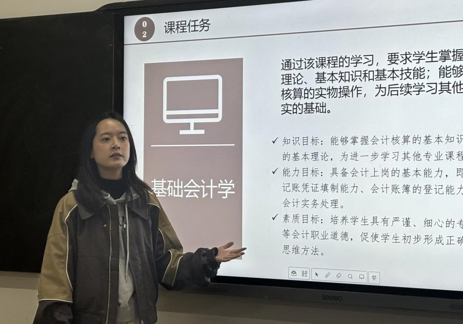 活动为期三周,每周一轮,三轮磨课覆盖会计职业道德、管理学、基础会计学、经济数学、Python在财务中的应用、劳动教育、老员工职业生涯规划与就业指导等课程,通过实战演练,切磋教学技能,助力新教师快速适应教学环境。每轮磨课均包含教学展示、现场点评与反馈、教学反思与重构等环节,确保每位教师都能在实践中学思践悟,不断进步。