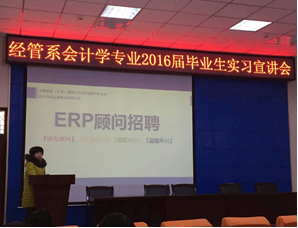 1月14日上午10点,会计学专业2016届毕业生实习宣讲会在樊川讲堂举行,本次宣讲会邀请到了金蝶国际软件集团、瑞博会计师事务所和中华会计网校等三家国内较为知名的企业进行会计实习岗位介绍。经管系副主任唐蜀湘、科研实践秘书任芳容、会计教研室主任邵敏等出席了宣讲会。