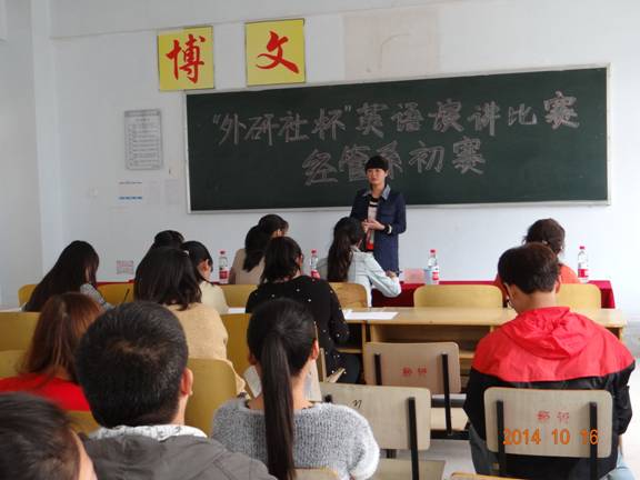 为提高我系老员工英语应用水平,激发广大同学学习英语的兴趣,同时为2014年“外研社杯”全国英语演讲大赛暨陕西省老员工英语演讲比赛选拔参赛选手,我系于10月16日下午1:50在2号教学楼301教室举办了“2014年‘外研社杯’全国老员工英语演讲比赛经管系预赛”。