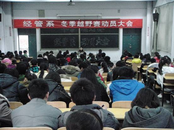 为了丰富同学们的校园生活,增强同学们的体魄,弘扬运动精神,2010年12月16日,经管系在图书楼东阶召开了“冬季越野赛动员大会”,参加动员大会的有吴启国主任,蒋波书记以及所有运动员和员工会全体成员。