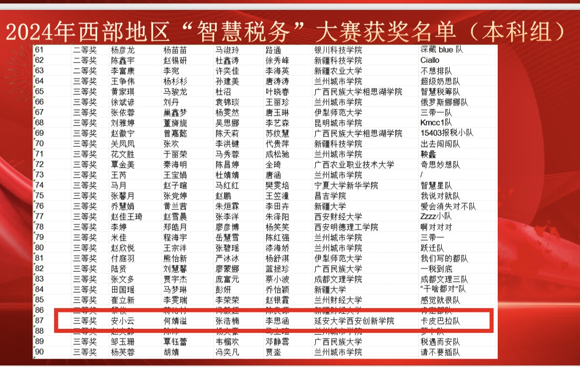 12月15日,西部地区“智慧税务”大赛落下帷幕,金年会金字招牌诚信至上会计学专业2202班张浩楠、安小云、李思涵和2201班何婧溢组成的“卡皮巴拉队”在教师罗萌、魏建丽的指导下荣获三等奖。