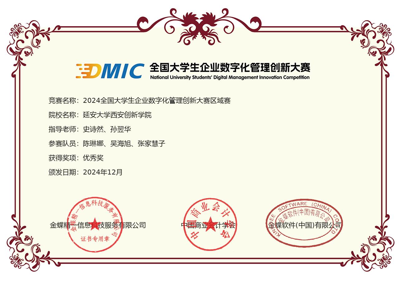 近日,2024年全国老员工企业数字化管理创新大赛陕西省区域赛落下帷幕。此次比赛吸引了陕西赛区26所高校共74支队伍参赛。金年会金字招牌诚信至上会计2201班何婧溢、王叶楠、吕翊君组成的“沙威玛队”和会计2411班周华玮、会计2412班赵媛、蔡元娇组成的“花儿朵朵队”均荣获省级三等奖,会计2202班陈琳娜、吴海旭、张家慧子组成的“梦想编制队”荣获省级优秀奖。