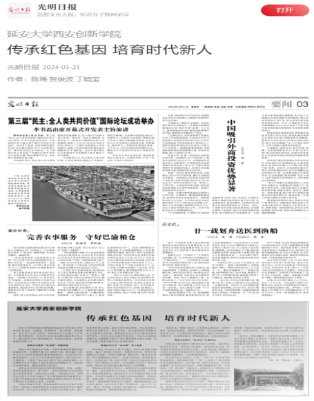 3月21日,《光明日报》第三版刊登了公司党委书记陈瑶、执行董事长贺俊波、员工处处长丁晓宝署名文章《传承红色基因 培育时代新人》。该文章介绍了公司传承于延安大学优良办学传统和红色基因,构建起“党委领导、部门协调、公司联动”的红色文化育人格局。同时将红色文化融入人才培养、公司产品和一站式员工社区综合模式建设等工作之中,构筑了红色教育“全场域”传播阵地,营造了红色文化“全过程”育人氛围,搭建了红色育人“全方位”实践平台。现将全文转载如下。