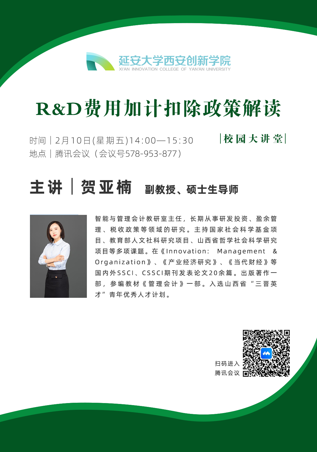 公司特邀贺亚楠副教授为师生作报告,报告主题为《R&D费用加计扣除政策解读》
