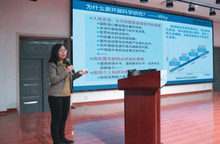 窦教授从为什么做科研入手,认为科研是推动社会进步的重要动力,是提升个人专业素养和能力的重要途径。她鼓励在场的师生们积极参与科研工作,通过科研活动提升自己的专业素养和实践能力。对什么时候做科研这个问题,她指出,科研工作并不局限于特定的时间段,而是需要持续的投入和坚持。她鼓励师生们在平时的学习、工作中发现问题,提出研究课题,然后利用课余时间进行深入的研究。在做什么科研的问题上,窦教授分享了她的研究经验和心得。她认为,科研工作应该选择自己感兴趣且具有实际意义的题目,这样才能保证研究的持久性和深度。最后,窦教授重点讲解了论文写作及项目申请的技巧。她强调,论文写作需要严谨的逻辑和清晰的表达,而项目申请则需要有明确的目标、合理的预算和可行的计划。窦教授现场还解答了老师们提出的问题,包括如何选择合适的研究方法、如何搜集和处理研究过程中需要的数据等,她的专业解答赢得了在场师生们的热烈掌声。